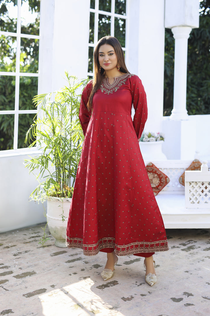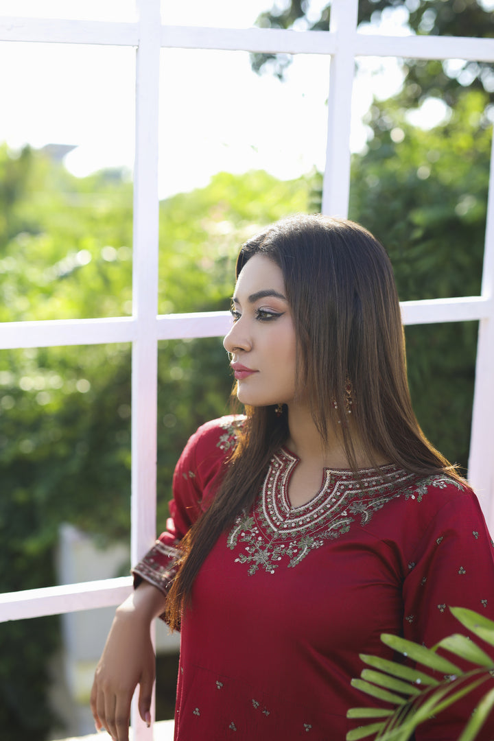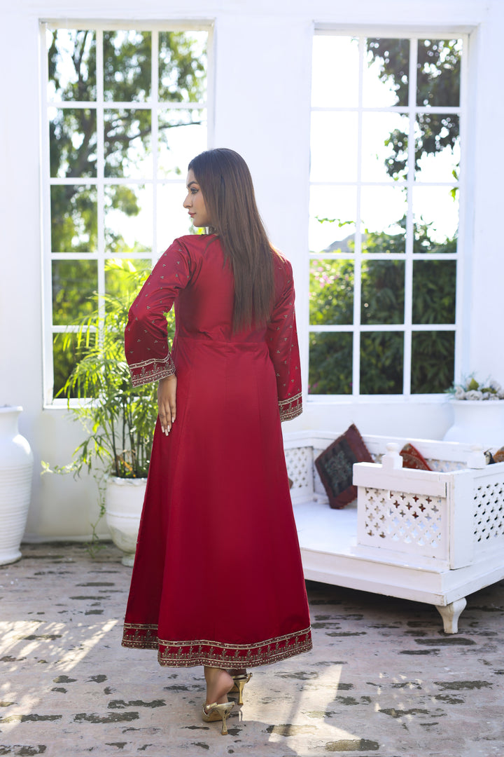 Shirt Fully Embroidered Frock, Full Embroidered Sleeves, Embroidered Neck, Long Length , Plain Back Fabric Type: Khaadi Colour: Red |