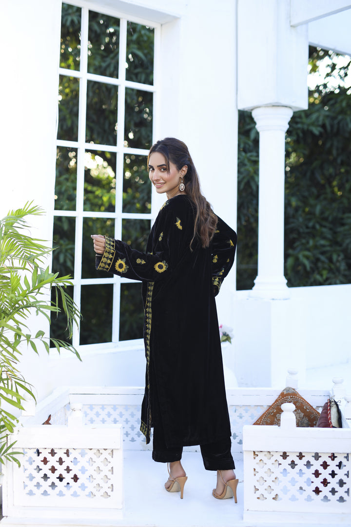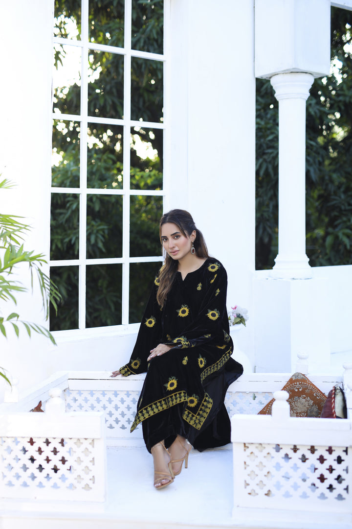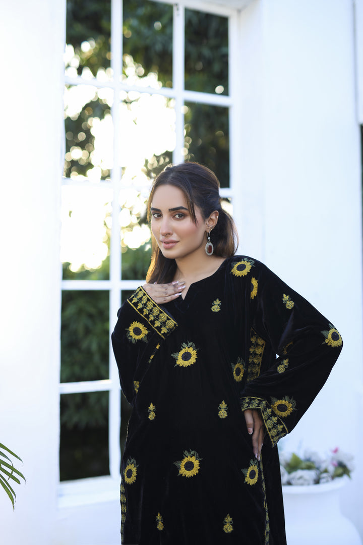 Shirt Fully Embroidered Shirt with Yellow Sunflowers, Full Embroidered Sleeves, Long Length, Plain Back Fabric Type: Luxury Velvet Colour: Black |
